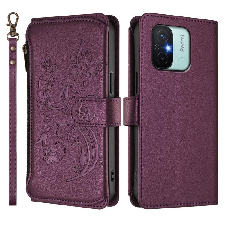 Funda de cuero con cremallera para Redmi 11A / Xiaomi Poco C55, diseño de mariposas, flores y mariposas (morado oscuro)