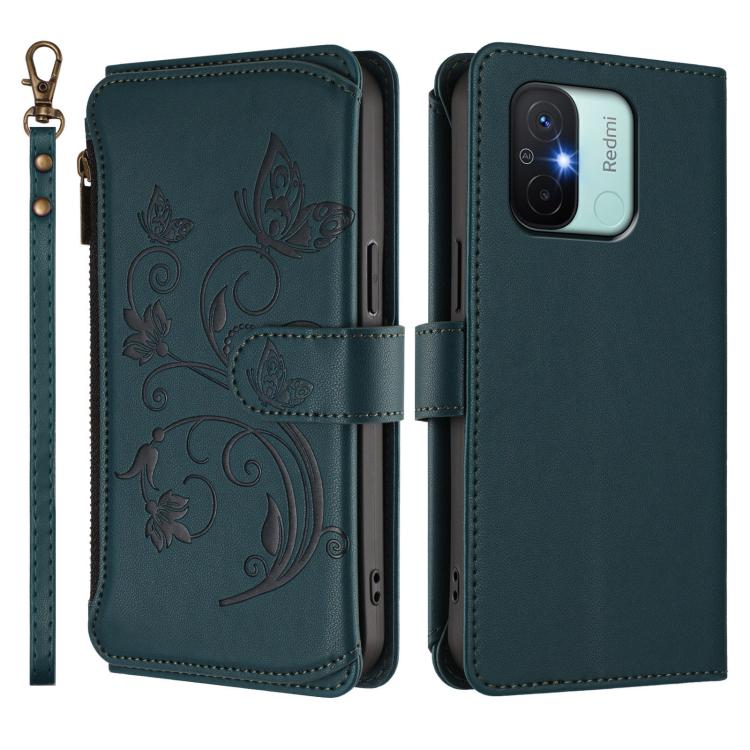 Funda de cuero con cremallera para Redmi 11A / Xiaomi Poco C55, diseño de mariposas, flores y mariposas (verde oscuro)