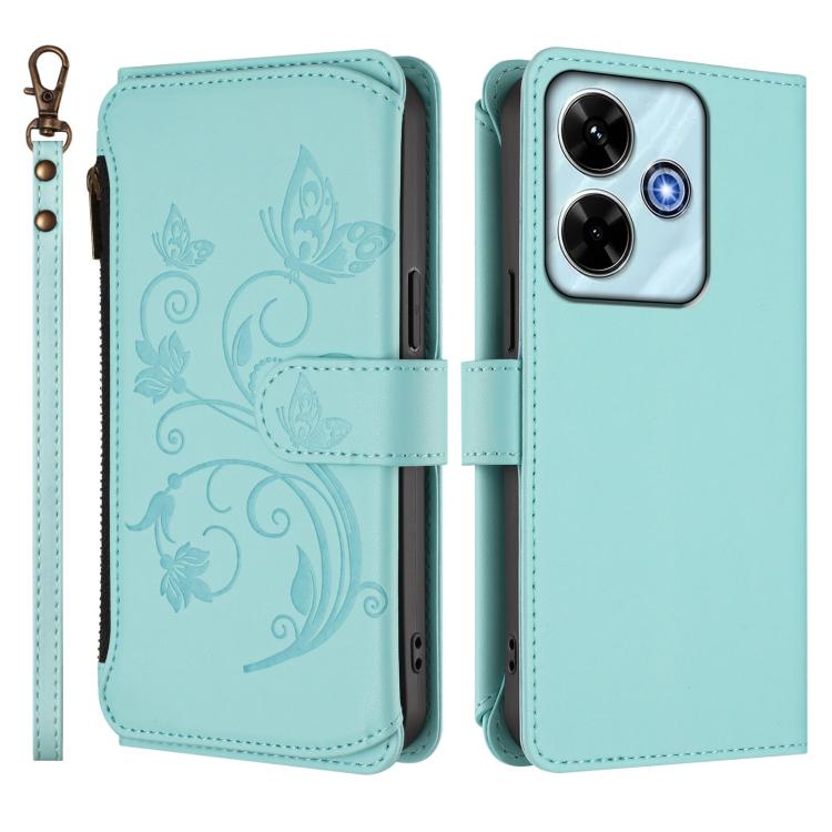 Funda de cuero con cremallera para Redmi 13 4G / 5G / 13x / Xiaomi Poco M6 4G, diseño de mariposas y flores, con múltiples tarjetas (verde menta)
