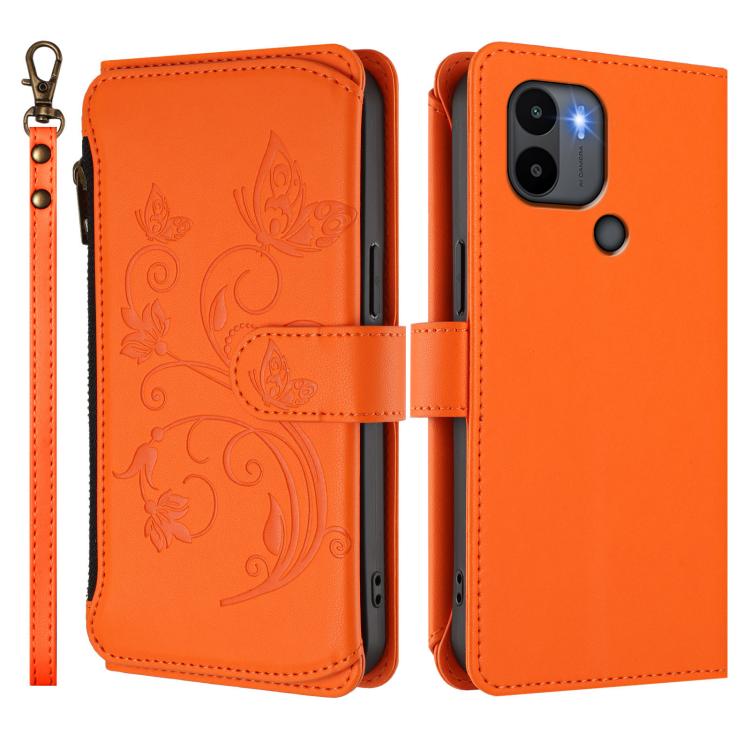 Funda de cuero con cremallera para Redmi A1+ / A2+ / Xiaomi Poco C51, diseño de mariposas y flores, con múltiples tarjetas (naranja)