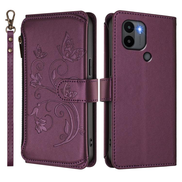 Funda de cuero con cremallera para Redmi A1+ / A2+ / Xiaomi Poco C51, diseño de mariposas y flores (morado oscuro)