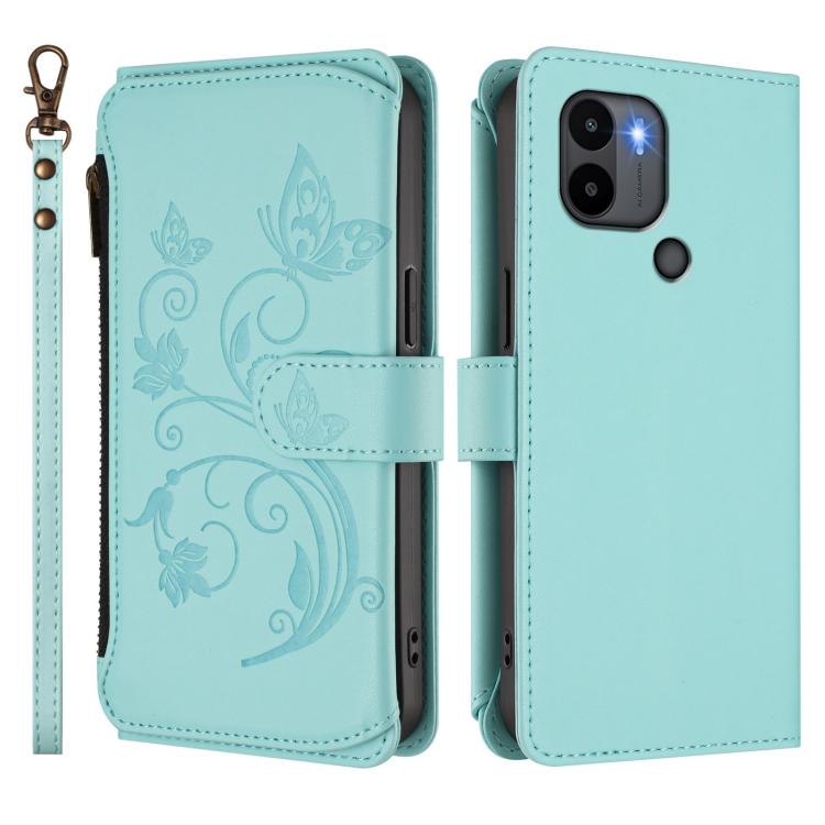Funda de cuero con cremallera para Redmi A1+ / A2+ / Xiaomi Poco C51, diseño de mariposas y flores (verde menta)