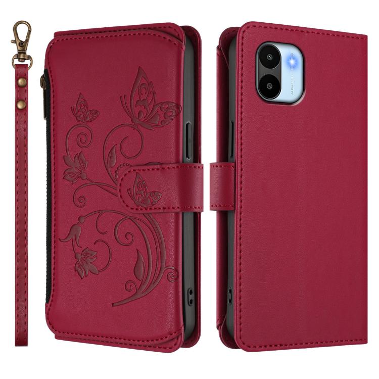 Funda de cuero con cremallera para Redmi A1/Redmi A2, diseño de mariposas y flores (rojo vino)