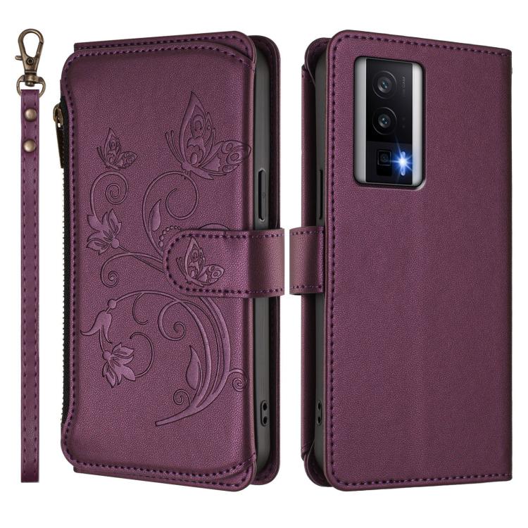 Funda de cuero con cremallera para Redmi K60/K60 Pro, diseño de mariposas, flores y amor, con múltiples tarjetas (morado oscuro)