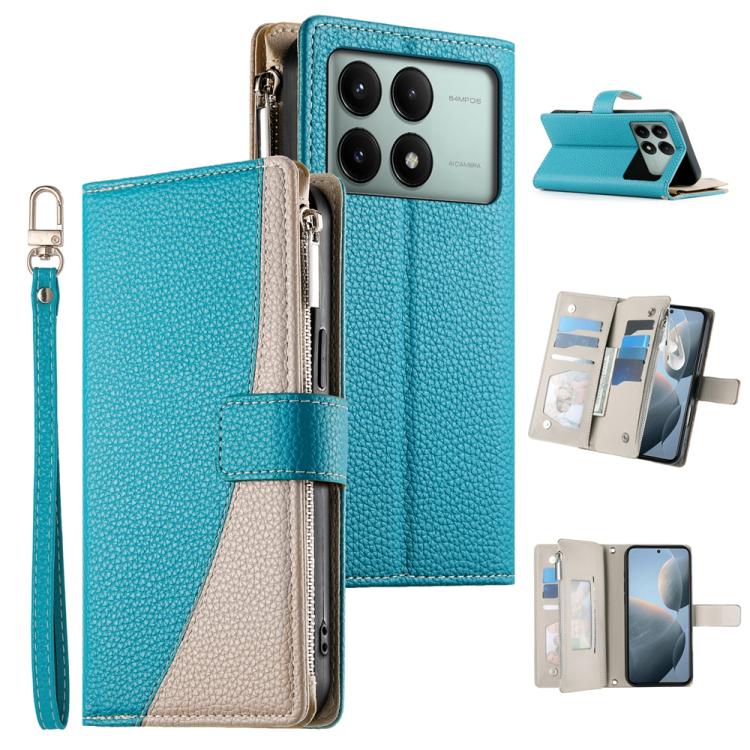 Funda de cuero con cremallera para Redmi K70E y Xiaomi Poco X6 Pro, con costuras, múltiples tarjetas y correa corta (azul)
