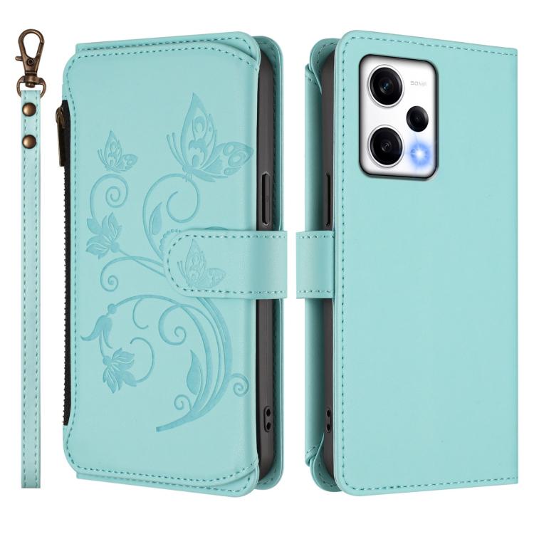 Funda de cuero con cremallera para Redmi Note 12 Pro+ Global / Note 12 Explorer, diseño de mariposas, flores y amor (verde menta)