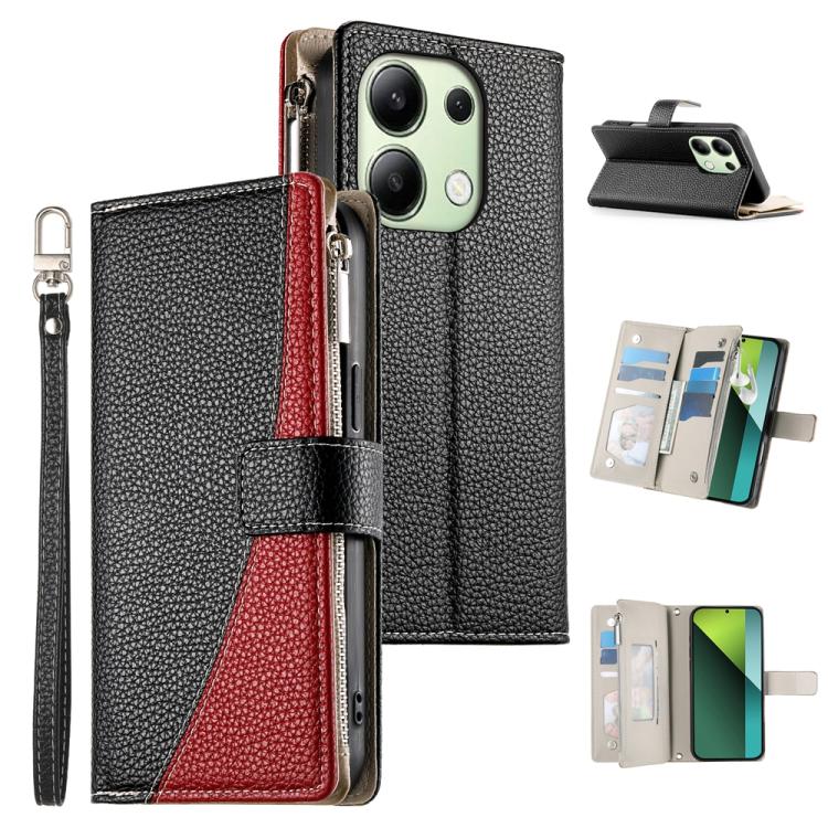 Funda de cuero con cremallera para Redmi Note 13 4G, con costuras globales, múltiples tarjetas y correa corta (negra)