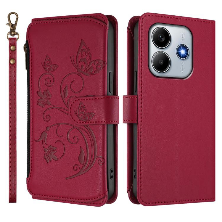 Funda de cuero con cremallera para Redmi Note 14 4G, 164,84 mm, diseño de mariposas, flores y múltiples tarjetas (rojo vino)
