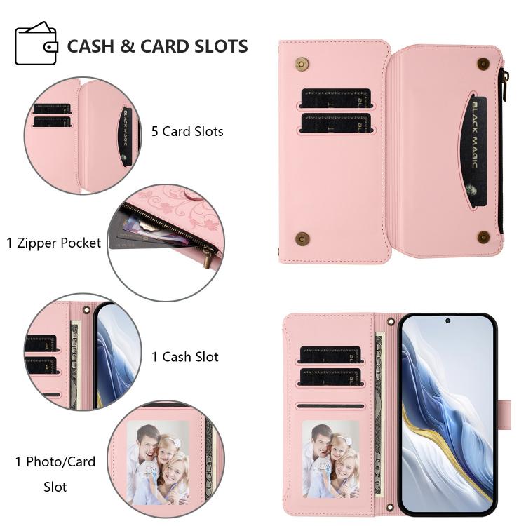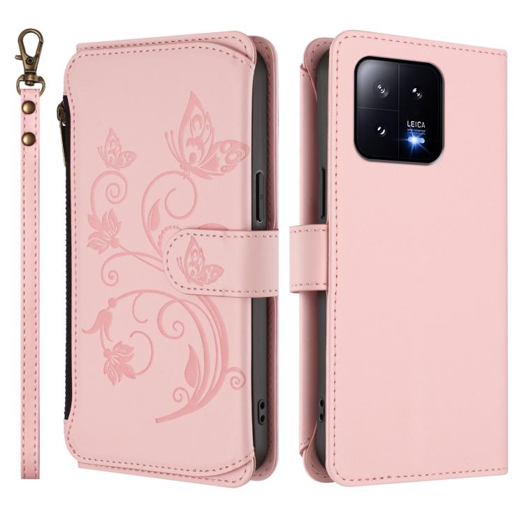 Funda de cuero con cremallera para Xiaomi 13, diseño de mariposas y flores, con múltiples tarjetas (rosa)