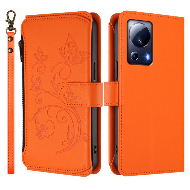 Funda de cuero con cremallera para Xiaomi 13 Lite / Civi 2, diseño de mariposas, flores y mariposas (naranja)