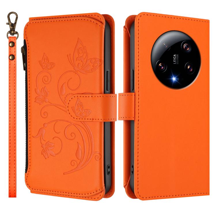 Funda de cuero con cremallera para Xiaomi 13 Ultra, diseño de mariposa, amor y flores, con múltiples tarjetas (naranja)