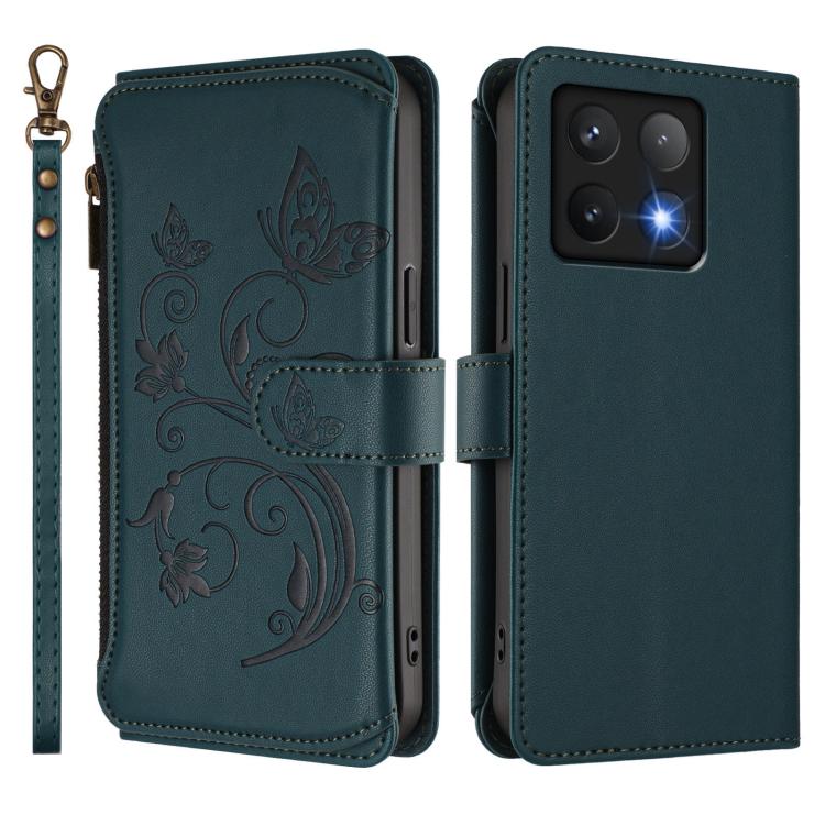 Funda de cuero con cremallera para Xiaomi 14T, diseño de mariposas y flores, con múltiples tarjetas (verde oscuro)