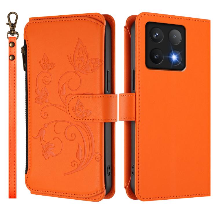 Funda de cuero con cremallera para Xiaomi 14T Pro, diseño de mariposas, flores y mariposas (naranja)