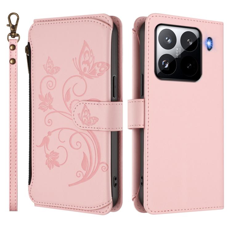 Funda de cuero con cremallera para Xiaomi 15 Pro, diseño de mariposas, flores y mariposas (rosa)