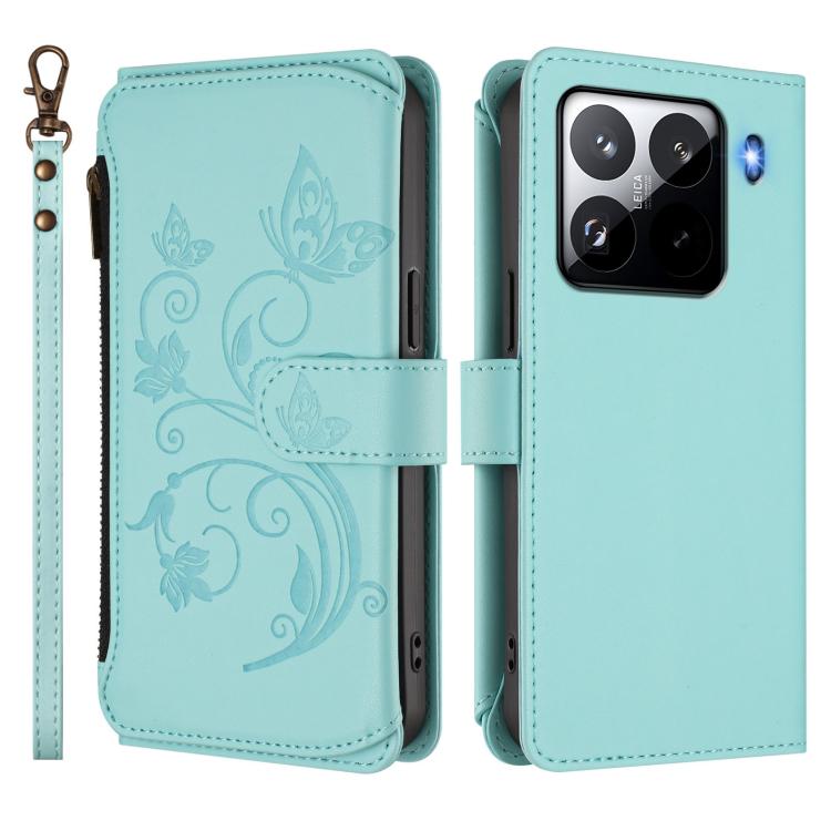 Funda de cuero con cremallera para Xiaomi 15 Pro, diseño de mariposas, flores y múltiples tarjetas (verde menta)