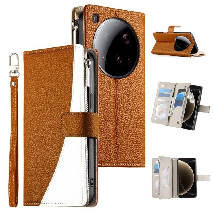 Funda de cuero con cremallera para Xiaomi 15 Ultra, con múltiples tarjetas y costuras, con correa corta (marrón)