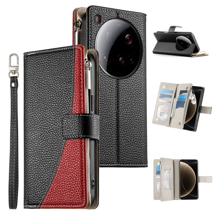 Funda de cuero con cremallera para Xiaomi 15 Ultra, con múltiples tarjetas y costuras, con correa corta (negra)