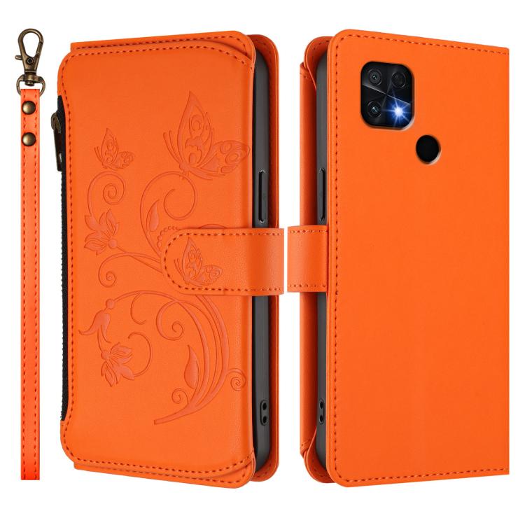Funda de cuero con cremallera para Xiaomi Poco C40/Redmi 10C, diseño de mariposas, flores y múltiples tarjetas (naranja)
