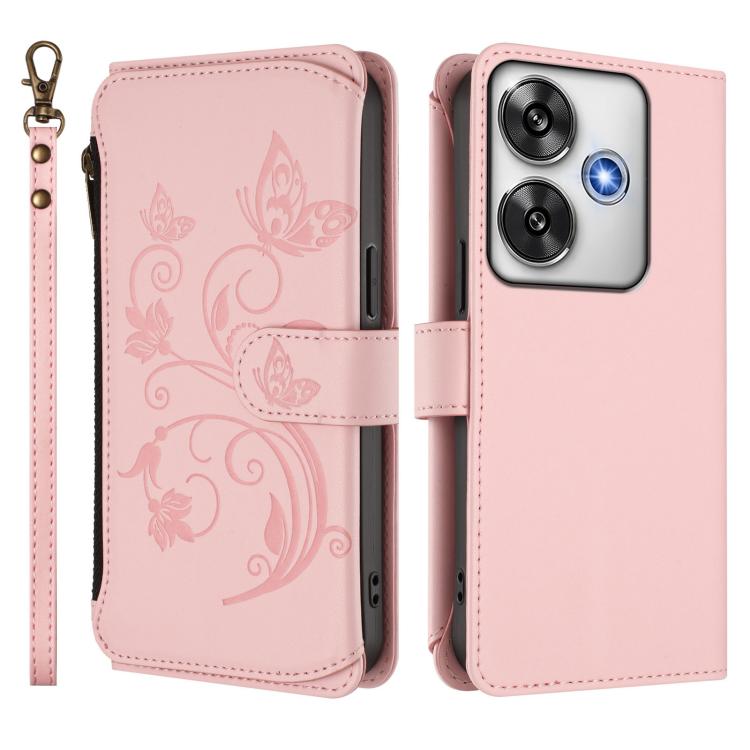 Funda de cuero con cremallera para Xiaomi Poco F6, diseño de mariposas, flores y mariposas (rosa)