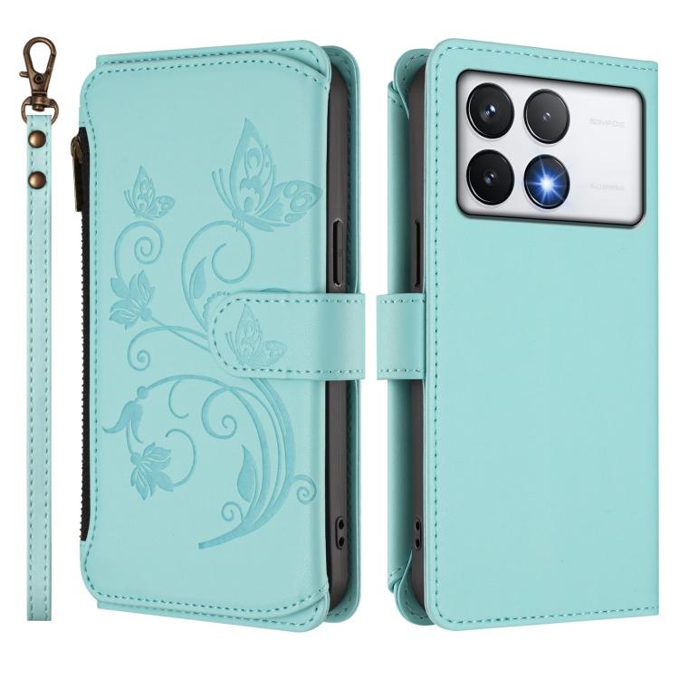Funda de cuero con cremallera para Xiaomi Poco F6 Pro, diseño de mariposas y flores, con múltiples tarjetas (verde menta)