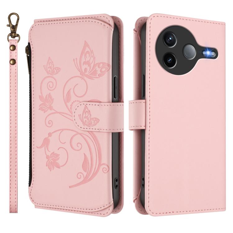Funda de cuero con cremallera para Xiaomi Poco F7 Pro / Redmi K80, diseño de mariposas, flores y mariposas (rosa)