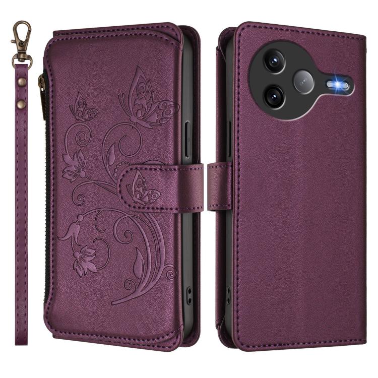 Funda de cuero con cremallera para Xiaomi Poco F7 Ultra / Redmi K80 Pro, diseño de mariposas, flores y mariposas (morado oscuro)
