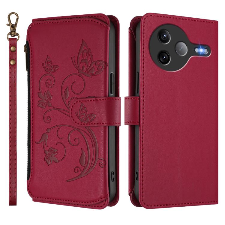 Funda de cuero con cremallera para Xiaomi Poco F7 Ultra / Redmi K80 Pro, diseño de mariposas, flores y mariposas (rojo vino)