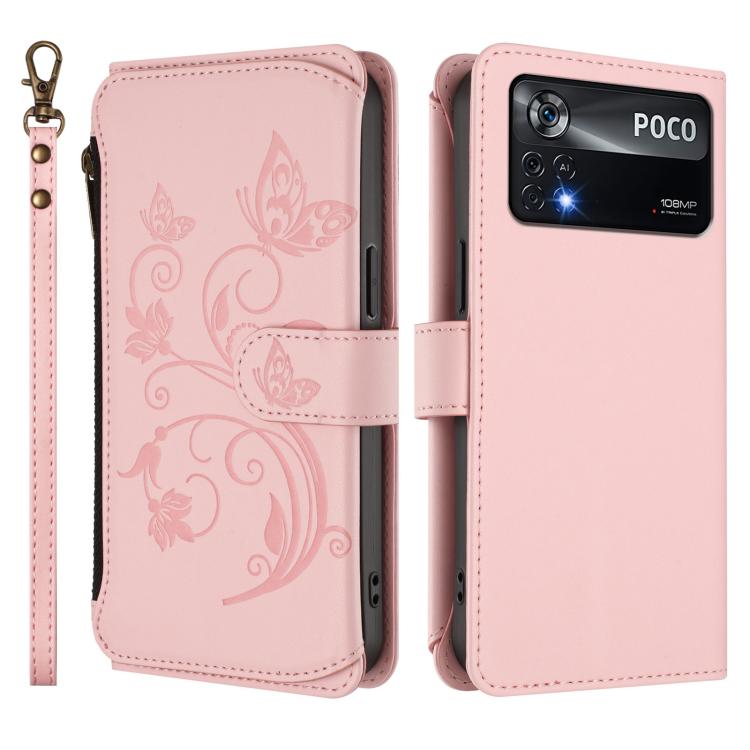 Funda de cuero con cremallera para Xiaomi Poco X4 Pro 5G, diseño de mariposas, flores y mariposas (rosa)
