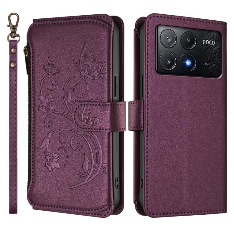 Funda de cuero con cremallera para Xiaomi Poco X6 Pro, diseño de mariposas, flores y mariposas (morado oscuro)