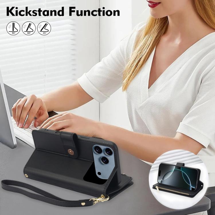 Funda de cuero con cremallera rómbica para iPhone 17 Pro YM016 con tarjetero y cordón (negra)