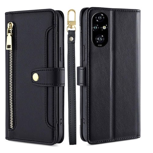 Funda de Cuero con Cremallera y Textura de Oveja para Honor 200 Pro 5G (Negro)