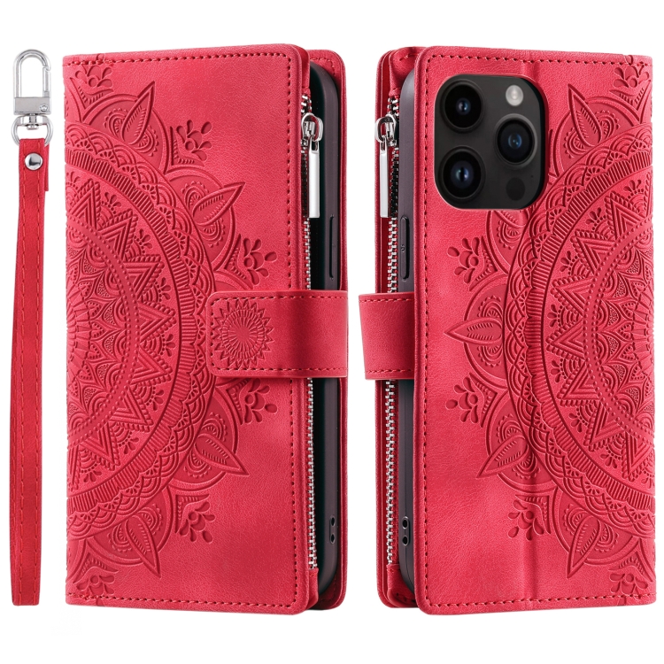 Funda de Cuero para iPhone 16 Pro Max con Cremallera y Múltiples Tarjetas (Rojo)