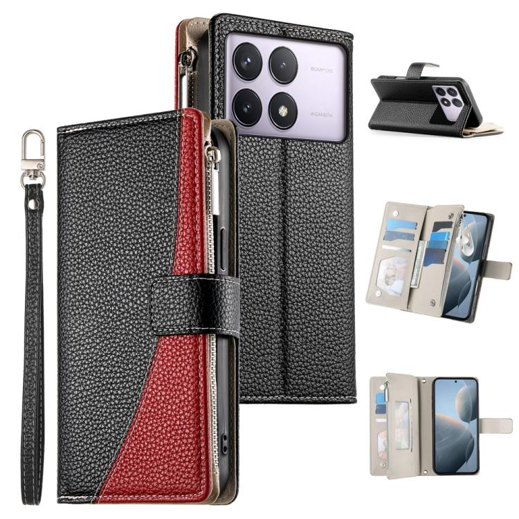 Funda de cuero con cremallera y múltiples tarjetas para Redmi K70 / K70 Pro / Poco F6 Pro, con costuras y correa corta (negra)
