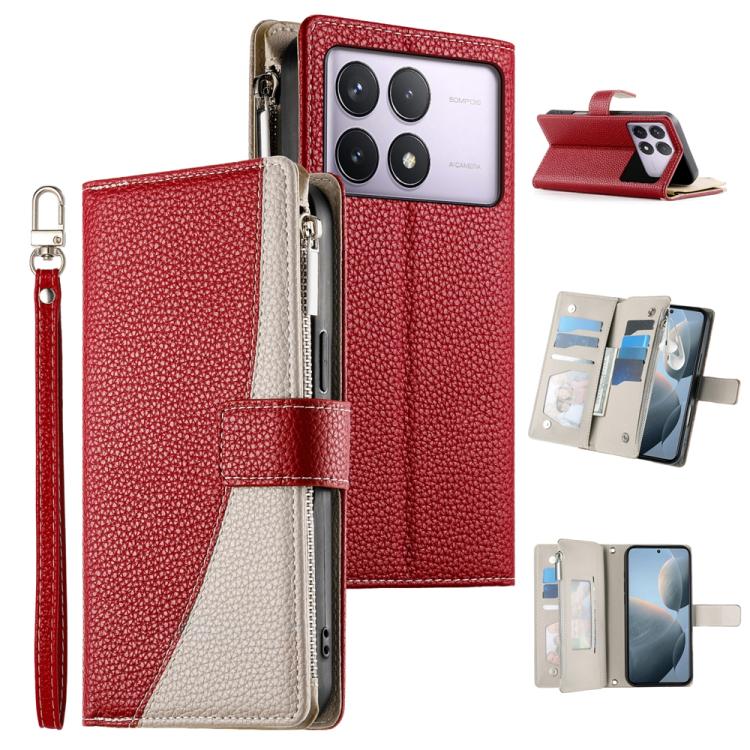 Funda de cuero con cremallera y múltiples tarjetas para Redmi K70 / K70 Pro / Poco F6 Pro, con costuras y correa corta (roja)