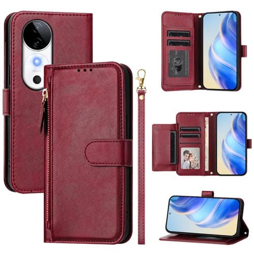 Funda de Cuero con Cremallera y Ranuras para Varias Tarjetas para Vivo S19 (Rojo Oscuro)