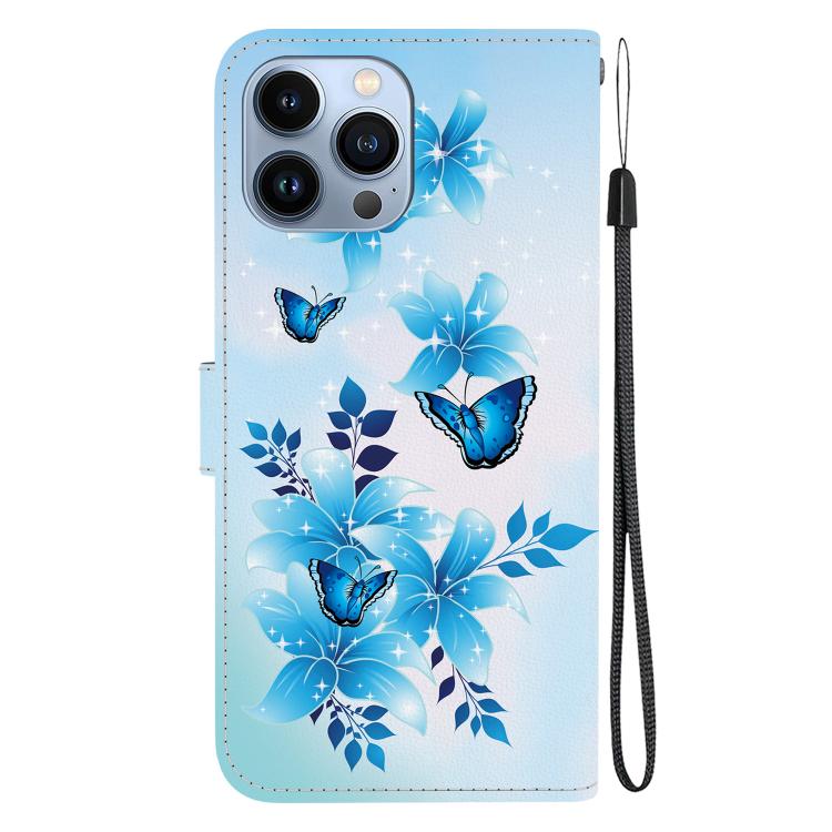 Funda de Cuero para iPhone 15 Pro Max con Dibujo de Colores y Textura de Cristal (Mariposas Azules)