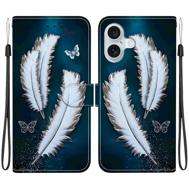 Funda de Cuero para iPhone 16 con Dibujo de Colores y Textura de Cristal (Plumas de Mariposa Blancas)