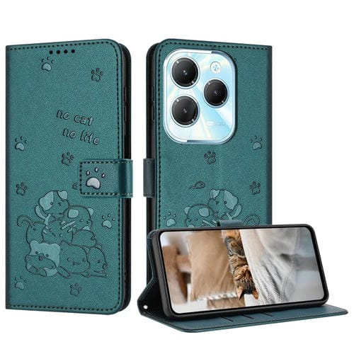 Funda de Cuero para Tecno Spark 20 Pro con Diseño de Gatito en Relieve y Cordón (Verde Oscuro)