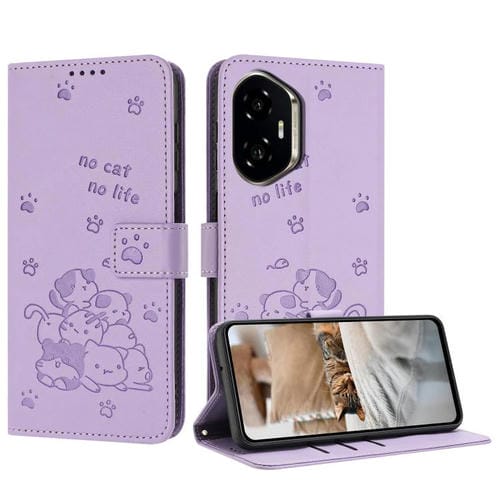 Funda de Cuero para Honor 300 con Diseño de Gatito en Relieve y Cordón (Morado)