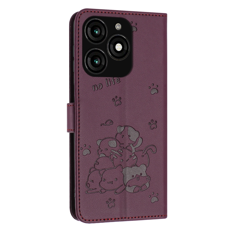 Funda de Cuero Itel A70 con Diseño de Gatito en Relieve y Cordón (Rojo Vino)