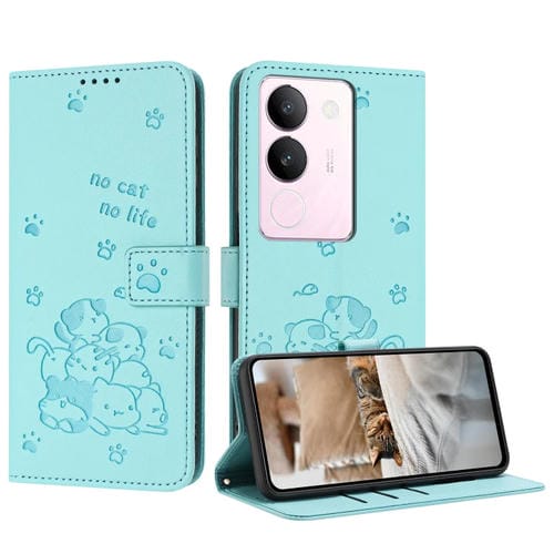 Funda de Piel con Diseño de Gatito En Relieve y Cordón para Vivo S17/S17 Pro/S17T (Verde Menta)