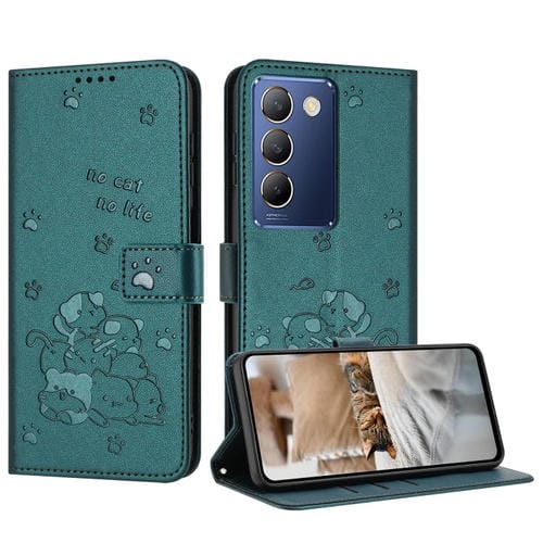 Funda de Cuero con Estampado de Gatito y Cordón para Vivo Y100 Idn / Y200E 5G (Verde Oscuro)