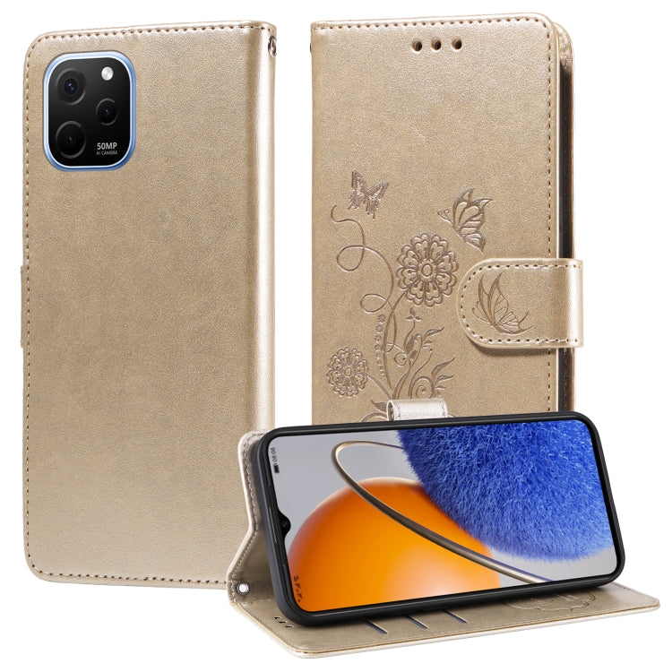 Funda de Cuero Huawei Nova Y61 Enjoy 50Z Diseño Mariposas y Flores En Relieve (Dorada)