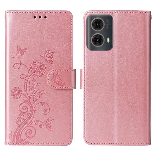 Funda de Cuero Motorola Moto G85/S50 Neo con Diseño de Mariposas y Flores en Relieve (Oro Rosa)