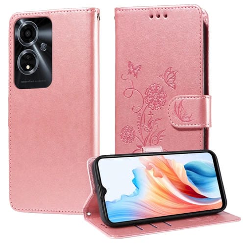 Funda de Cuero con Diseño de Mariposas y Flores En Relieve para Oppo A59 5G (Oro Rosa)