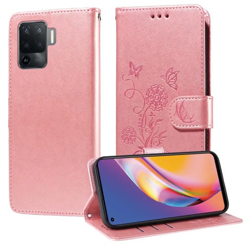 Funda de Cuero con Diseño de Mariposas y Flores En Relieve para Oppo A94 4G/5G/A95 5G/F19 Pro (Oro Rosa)