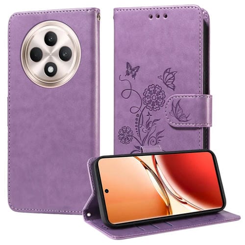 Funda de Cuero con Diseño de Mariposas y Flores En Relieve para Oppo Reno12 F 5G (Morado)