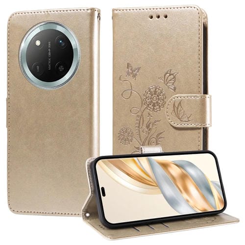 Funda de Cuero Honor X9C Magic7 Lite con Diseño de Mariposas y Flores en Relieve (Dorada)