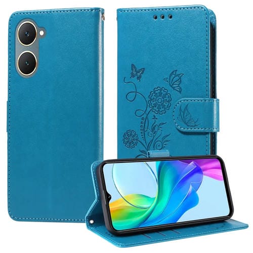 Funda de Cuero con Diseño de Mariposas y Flores En Relieve para Vivo Y03 4G / Y18 / Y28S 5G (Azul)