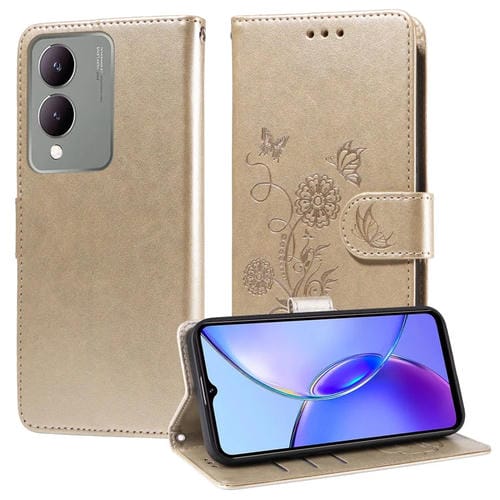 Funda de Cuero con Diseño de Mariposas y Flores En Relieve para Vivo Y17S / Y36I 5G / Y28 5G (Dorada)